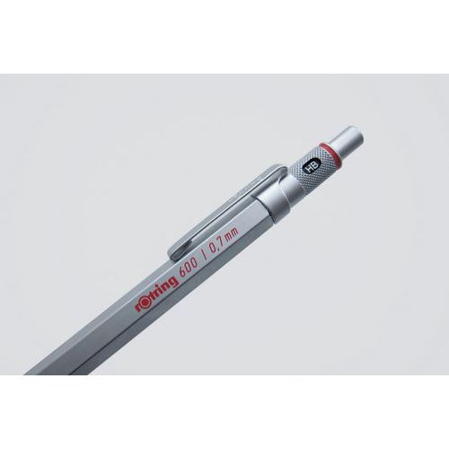 rOtring 600 0.7-mm mechanical pencil with all-metal body. Its perfectly balanced weight allows you to write and draw without fatigue. Brass mechanism for precision lead advancement. Lead-hardness grade indicator for easier identification while working. This mechanical pencil has a hexagonal shape to stop it rolling on your table or workspace. The fixed lead-guidance sleeve prevents the lead from breaking and ensures that the page remains fully visible for precise drawing with a ruler.