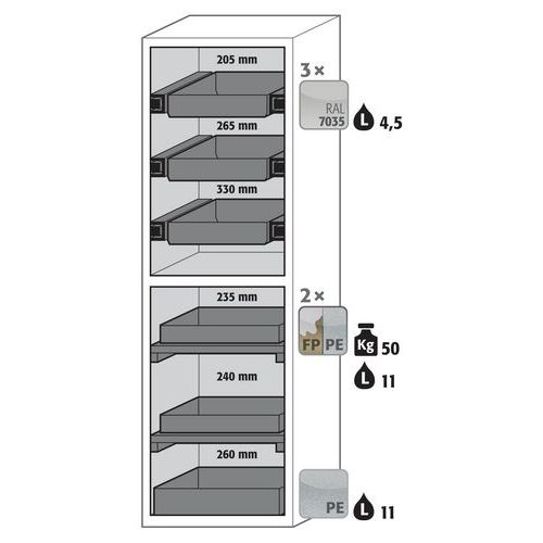 - Several compartments allow the storage of hazardous, flammable and corrosive substances in the same cabinet.