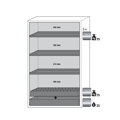 Safely stores hazardous and flammable products in your work area. Robust and durable with its solid steel exterior structure. Several compartments allow the storage of hazardous, flammable and corrosive substances in the same cabinet. For your comfort and security, the doors close automatically.