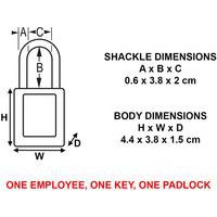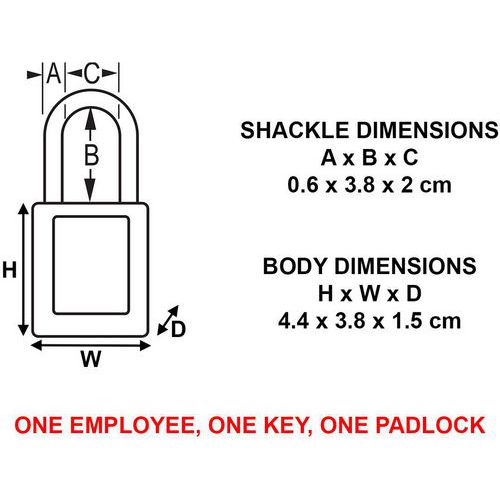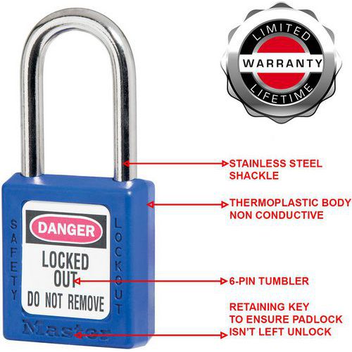 410 thermoplastic safety padlock. Thermoplastic blue body 1 1/2 in (38 mm) wide, 1 3/4 in (44 mm) tall, shackle with 1 1/2 in (38 mm) clearance. Designed exclusively for locking and labelling applications. Durable, lightweight and non-conductive thermoplastic lock body. High security, reserved-for-safety cylinder. Consider the LIFEGUARD service: Free registration service of key numbers used by a company to ensure that keys are not duplicated in your teams. Please specify this on your order.