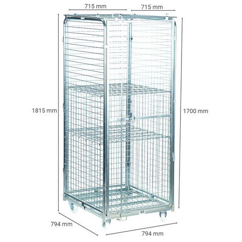 | Product Name | Safety roll container, Load capacity: 400 kg, O/A height: 1815 mm, O/A length: 794 mm, O/A depth: 794 mm |