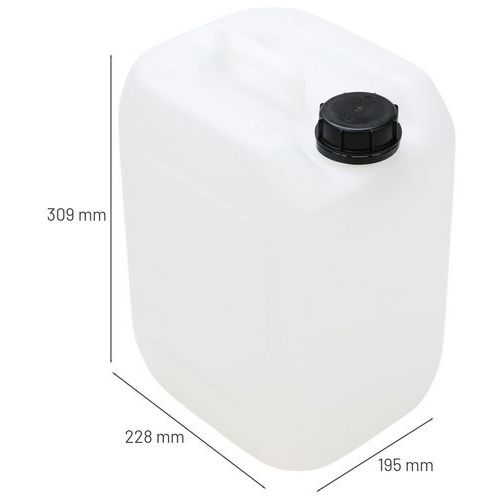 Plastic jerrycan approved for transporting goods. High resistance to falls, hydraulic pressure and stacking. Perfectly sealed packaging: air-pressure tested. Jerrycan with an upper handle for easy transport and handling. Large opening with hinged, tamper-evident screw cap.