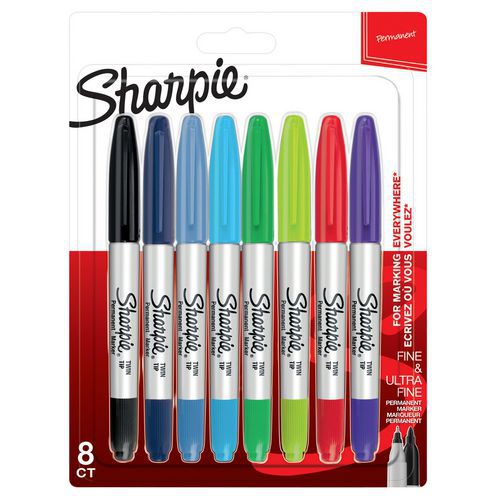 Sharpie permanent markers with fine and extra-fine twin tip. Assorted colours. Pack of eight