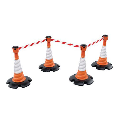 Each unit is equipped with 9 metres of high-quality retractable red/white or yellow/black fabric tape.