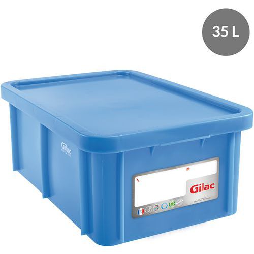 Stackable container with lid suitable for HACCP approach to food storage. Reliable and easily erasable labelling thanks to the integrated IML label. Recessed handles for improved handling. Stackable without lid. Design with no retention zone. Machine washable. Compatible with all Gilac 4- and 6-wheel bases.