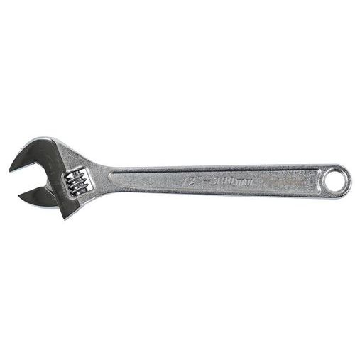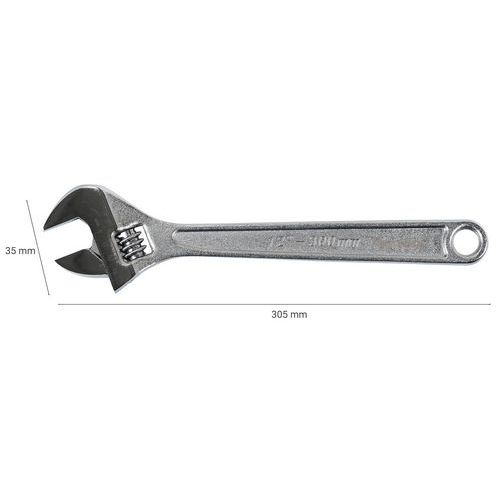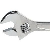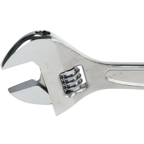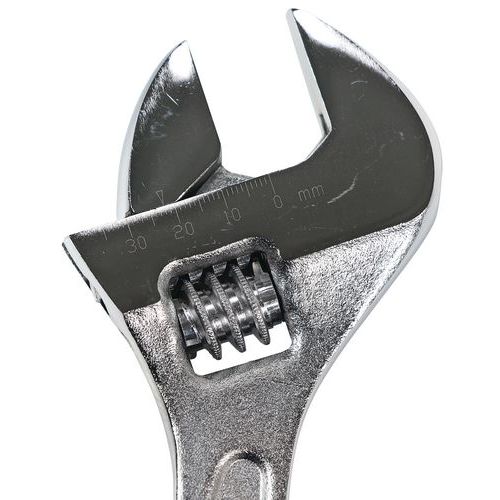 - Chrome-vanadium steel adjustable wrench with slimline head angled at 15°. Jaw ratchet system does not protrude.