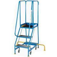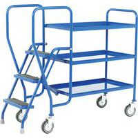 Spring loaded step unit with ribbed rubber treads, locates firmly on floor when foot placed on first step, immobilising trolley. Extended handrails for increased comfort and safety. Steel or plywood shelves. Fitted with 4 x 125mm diameter swivel castors. Rubber feet fitted to step unit for extra support. Blue epoxy finish. An invaluable aid for ensuring a quick and accurate pick in warehouses, production areas or workshops.