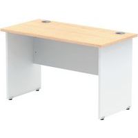 Heat resistant melamine finish. 25mm thick tops. 18mm modesty panels. 2mm protective ABS edging. 2 cable ports. Adjustable feet for levelling the desk on uneven floors. Secure steel to steel fixings. 2 modesty panels slots. The deep set modesty panel allows for compatibility of most screen clamp fittings.