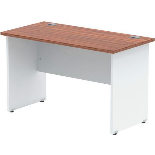 Heat resistant melamine finish. 25mm thick tops. 18mm modesty panels. 2mm protective ABS edging. 2 cable ports. Adjustable feet for levelling the desk on uneven floors. Secure steel to steel fixings. 2 modesty panels slots. The deep set modesty panel allows for compatibility of most screen clamp fittings.
