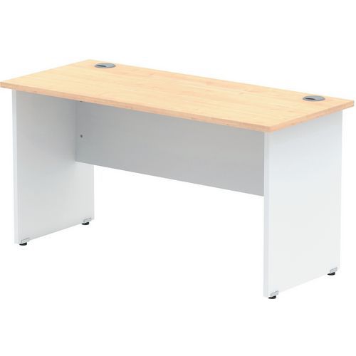 Heat resistant melamine finish. 25mm thick tops. 18mm modesty panels. 2mm protective ABS edging. 2 cable ports. Adjustable feet for levelling the desk on uneven floors. Secure steel to steel fixings. 2 modesty panels slots. The deep set modesty panel allows for compatibility of most screen clamp fittings.