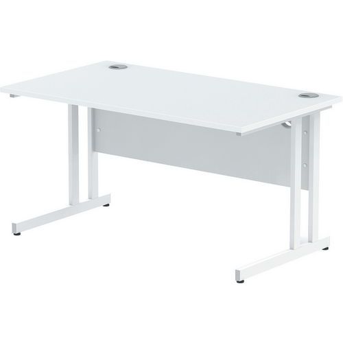 Heat resistant melamine finish. 25mm thick tops. 18mm modesty panels. 2mm protective ABS edging. 2 cable ports. Adjustable feet for levelling the desk on uneven floors. Secure steel to steel fixings. 2 modesty panels slots. The deep set modesty panel allows for compatibility of most screen clamp fittings.
