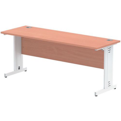 Heat resistant melamine finish. 25mm thick tops. 18mm modesty panels. 2mm protective ABS edging. 2 cable ports. Adjustable feet for levelling the desk on uneven floors. Secure steel to steel fixings. 2 modesty panels slots. The deep set modesty panel allows for compatibility of most screen clamp fittings.