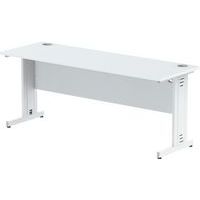 Heat resistant melamine finish. 25mm thick tops. 18mm modesty panels. 2mm protective ABS edging. 2 cable ports. Adjustable feet for levelling the desk on uneven floors. Secure steel to steel fixings. 2 modesty panels slots. The deep set modesty panel allows for compatibility of most screen clamp fittings.