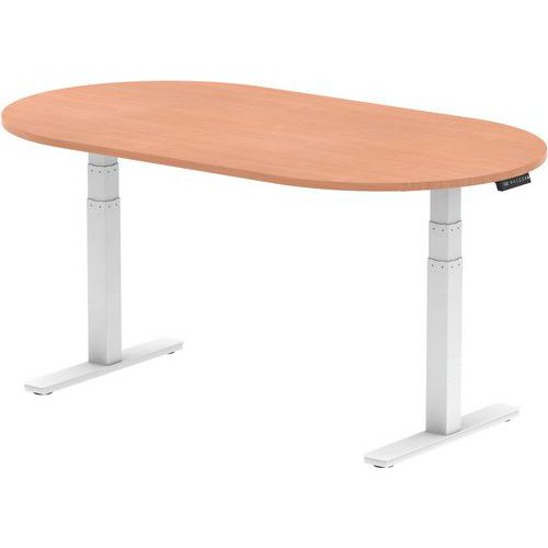 Impulse height adjustable boardroom table. 25mm thick top. The legs are powder-coated in an attractive silver colour. 2mm ABS protective edging. The tough melamine finish resists heat damage. Steel to steel fittings.