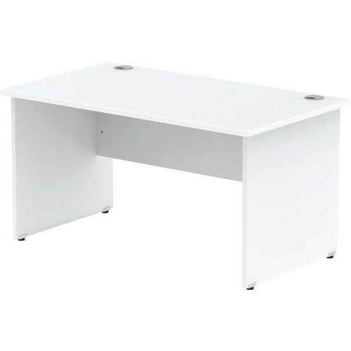 Heat resistant melamine finish. 25mm thick tops. 18mm modesty panels. 2mm protective ABS edging. 2 cable ports. Adjustable feet for levelling the desk on uneven floors. Secure steel to steel fixings. 2 modesty panels slots. The deep set modesty panel allows for compatibility of most screen clamp fittings.