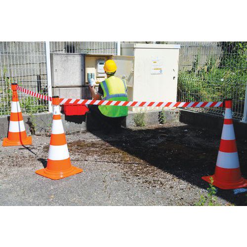 Comprising a head with 50mm x 3m strap and an adapter on fluorescent orange cone.