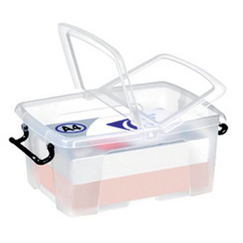 Strong plastic box with solid reinforced walls on 4 sides. Tapered shape ideal for stacking and storage. Easy side access via centre-hinged lid. Secure closure with 2 strong clip handles.