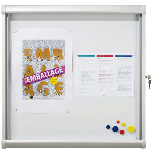Indoor enclosed bulletin board with natural anodised aluminium frame for a modern look. The practical magnetic metal board allows you to attach documents using magnets or write dry-wipe messages. Practical swing door with key lock for maximum security with the option to open towards the left or the right. The Securit glass door allows you to display your information securely.