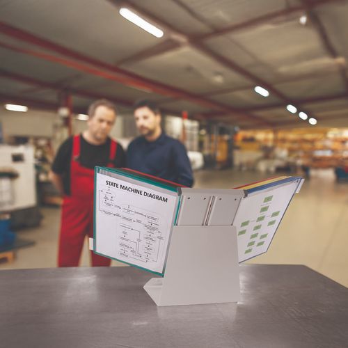 This wall mount keeps your important documents close at hand. The desk stand keeps your documents dust free. Ideal for any industrial environment.