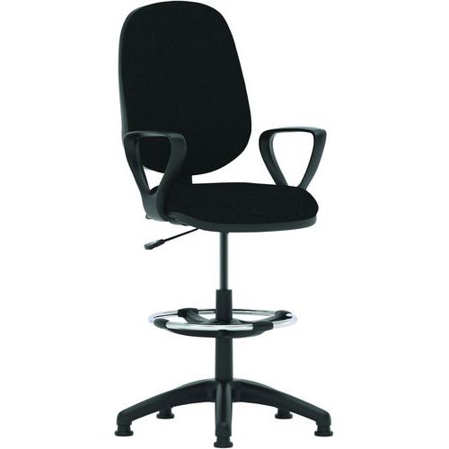 Cushioned seat pad with waterfall front. Cushioned dished seat design. Contoured backrest for added comfort. Single lever mechanism for gas lift control. Backrest angle adjustment. PCB: permanent contact backrest. The 5-star base with castors allows the chair to easily move to where it is needed.