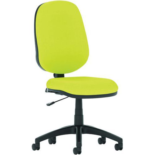 Cushioned seat pad with waterfall front. Cushioned dished seat design. Contoured backrest for added comfort. Single lever mechanism for gas lift control. Backrest angle adjustment. PCB: permanent contact backrest. The 5-star base with castors allows the chair to easily move to where it is needed.
