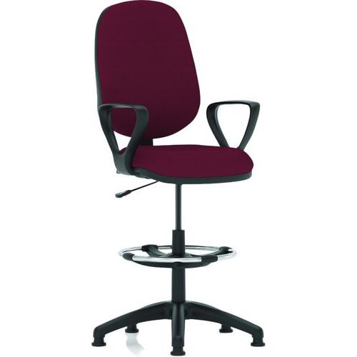Cushioned seat pad with waterfall front. Cushioned dished seat design. Contoured backrest for added comfort. Single lever mechanism for gas lift control. Backrest angle adjustment. PCB: permanent contact backrest. The 5-star base with castors allows the chair to easily move to where it is needed.