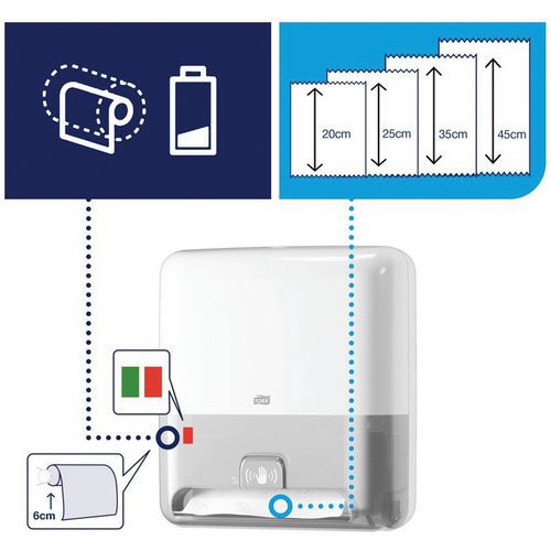 | Product Name | Tork Matic Sensor electric hand towel dispenser, Colour: White, Height: 400 mm, Width: 250 mm, Depth: 390 mm |