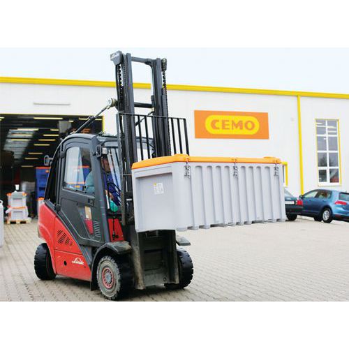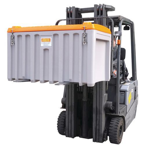 - Multi-purpose transport crate with grooves for forklift truck forks.