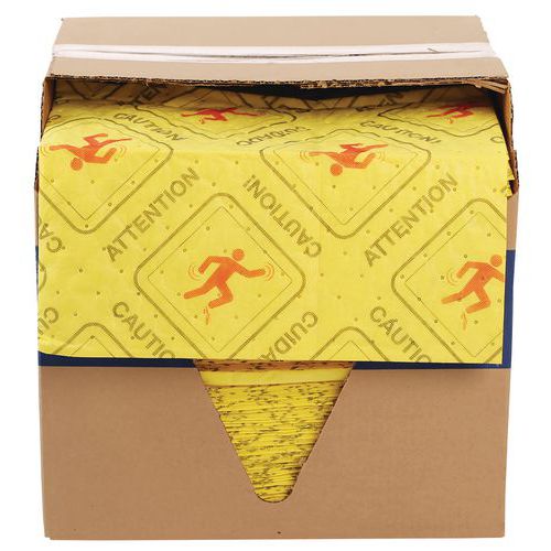 Absorbent with warning message for additional safety. Wipe away liquids and prevent the risk of slipping. High-visibility colour and safety pictogram encourage vigilance. High absorption capacity for non-chemical industrial liquids. Ideal for heavy-traffic areas with hazards of slipping, tripping and falling