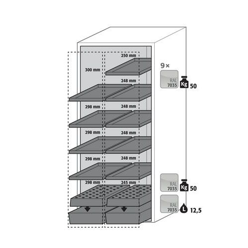 Safely stores hazardous and flammable products in your work area. Robust construction and long service life with a stable, high-quality and scratch-resistant cabinet body. The vertical drawer(s) open and close at the push of a button. The vertical drawer(s) provide an overview and easy access to the stored products. After sixty seconds, the drawers close automatically with visual and acoustic alarm indicators.