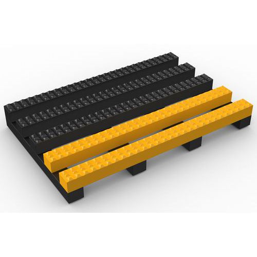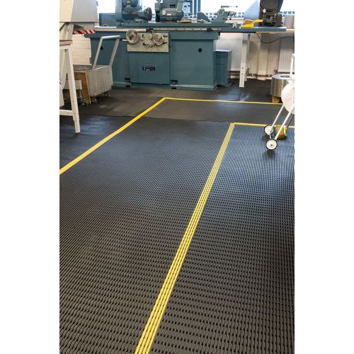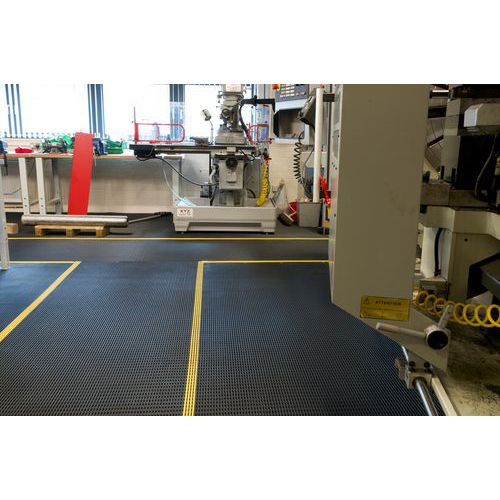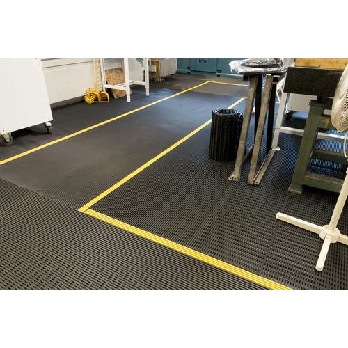 Non-slip, anti-fatigue flexible drainage matting sold by linear metre. Excellent drainage of fluids and small debris. Yellow bevelled border for a clearly defined edge. Diamond tip, non-slip surface. Increased productivity and reduced fatigue.