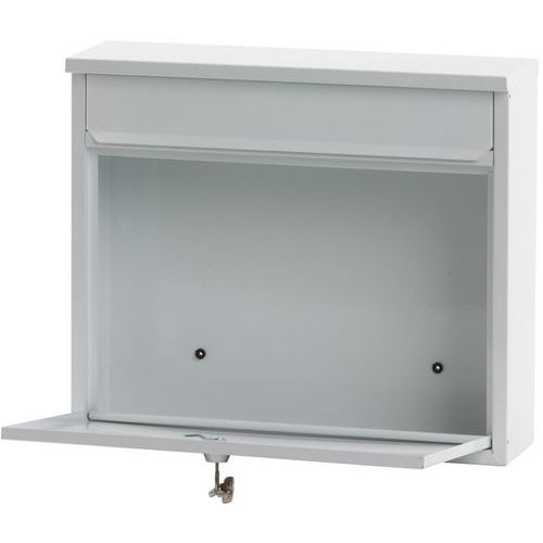- Wall-mounted metal letterbox with flap and a lockable front access door. Opening: 32 x 4 cm.
