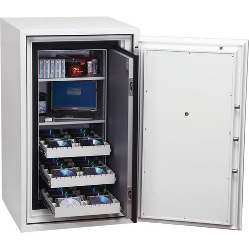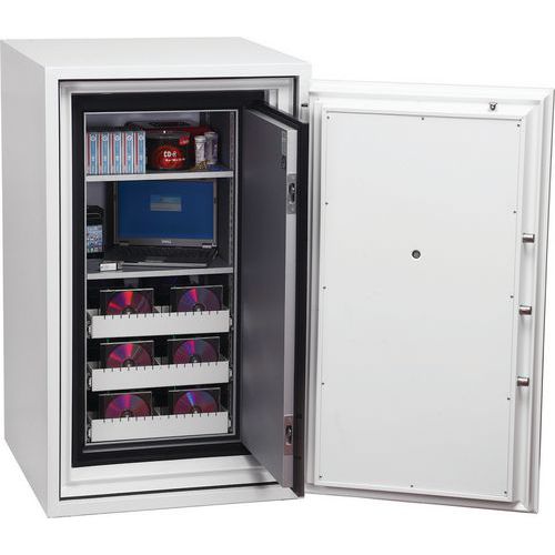Tested to Swedish NT Fire 017-120dis standard, providing 120 minutes of fire protection for computer backup tapes. Twin water-resistant seals provide an airtight, water-resistant inner compartment for your computer media. Choose between a quality key lock supplied with two keys, an LED electronic lock with programable hidden/scrambled code or a touchscreen keypad & fingerprint LED lock with an internal alarm, dual control, and hidden/scrambled code that can be programmed to recognise up to 128 fingerprints. Fire and impact tested from 9.1 metres for resistance. To the impact of falling through the burning floors of a building. Each unit comes complete with height-adjustable shelves and pull-out media trays. Finished in a high-quality scratch-resistant white paint RAL9003. Maintain GDPR Compliance at home or in the office by keeping your company’s vital and important records secure and protected. All cupboards of 690mm width are fitted with automatic slam-shut locking.