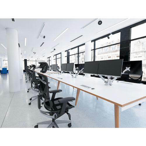 Adjustable feet for levelling the desk on uneven floors. Floating fixed desk top. Scalloped back edge for easy cable control. 2mm protective ABS edge. 25mm thick top.